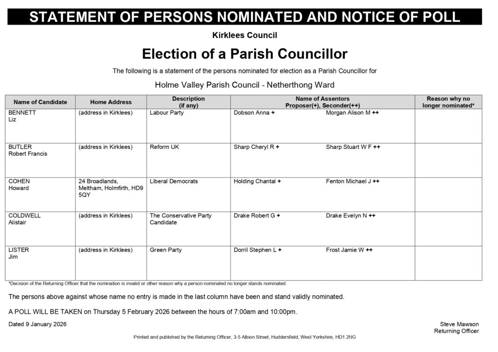 The following is a statement of the persons nominated for election as a Parish Councillor for Holme Valley Parish Council – Netherthong Ward