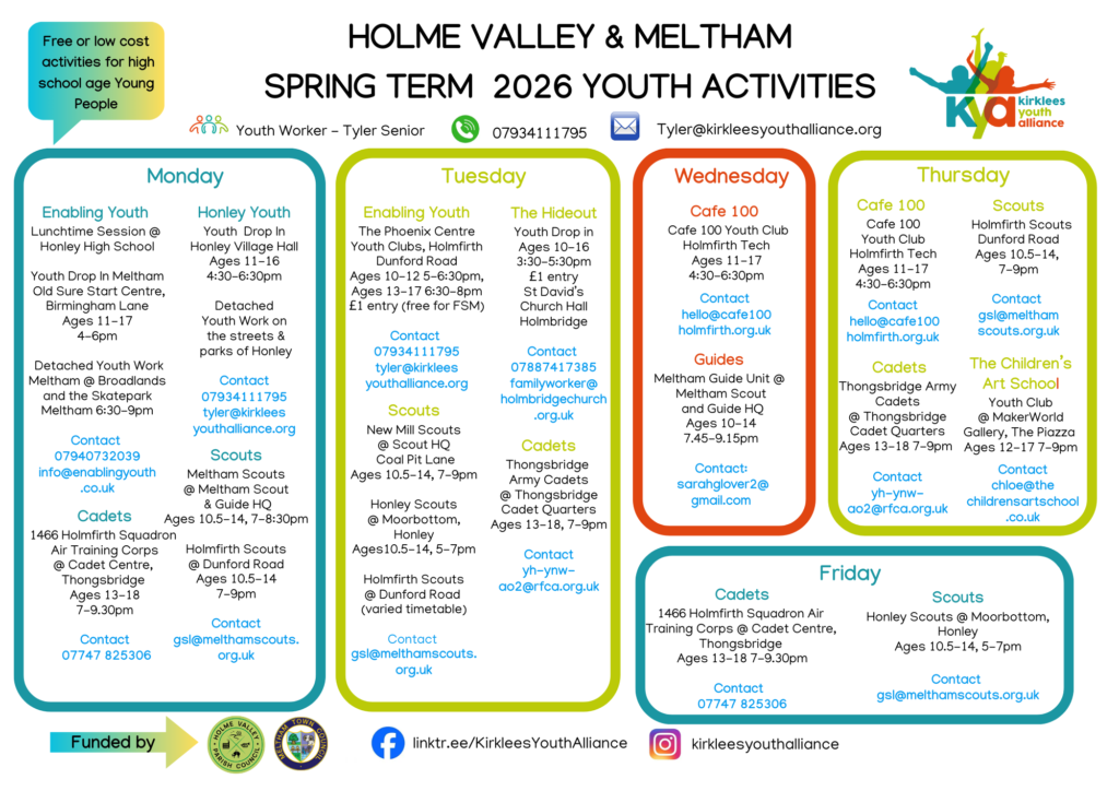 Parents, carers and young people can find out more about session times, age ranges and locations by contacting Kirklees Youth Alliance or speaking directly to the venues hosting sessions.